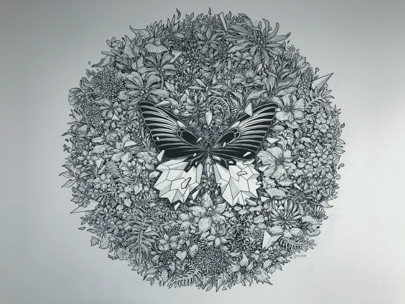 Napakacreative ng visual at kung paano niya inexecute yung idea; isang Magellan birdwing butterfly na may geometric na parte ng mga pakpak, at mga iba’t ibang foliage at ng floral life na pinapalibutan ng butterfly. Namamangha ako kung paano nya nagawa ang mga pinakamaliit na mga detalye ng mga halaman at bulaklak at kung paano niya inayos yung pagkakalagay ng mga ito (lalo na naidrawing niya ito na nakatayo; isang napakahirap na gawin para sa mga artist). Talagang napakahusay niyang illustrator.